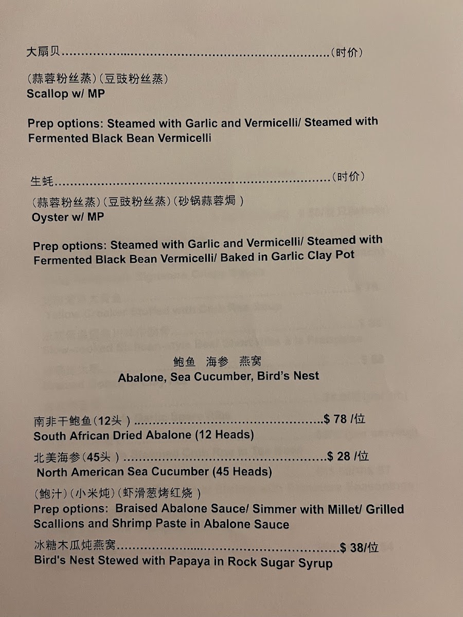 For seafood and premium delicacies, the menu features selections such as North American Sea Cucumber and Dried Fish Maw stewed with abalone sauce and millet, presenting options for braised or simmered preparations. Additional highlights include signature roast duck, crispy prawns in plum sauce, Shanghainese sautéed eel, chawanmushi with crab roe, crispy squab, Shanghai pan-fried buns, sous-vide Szechuan-style beef short ribs, fine slice jellyfish with yuzu sauce, Xiao Long Bao, bamboo shoots, braised black cod, fish soup, and Dungeness crab.