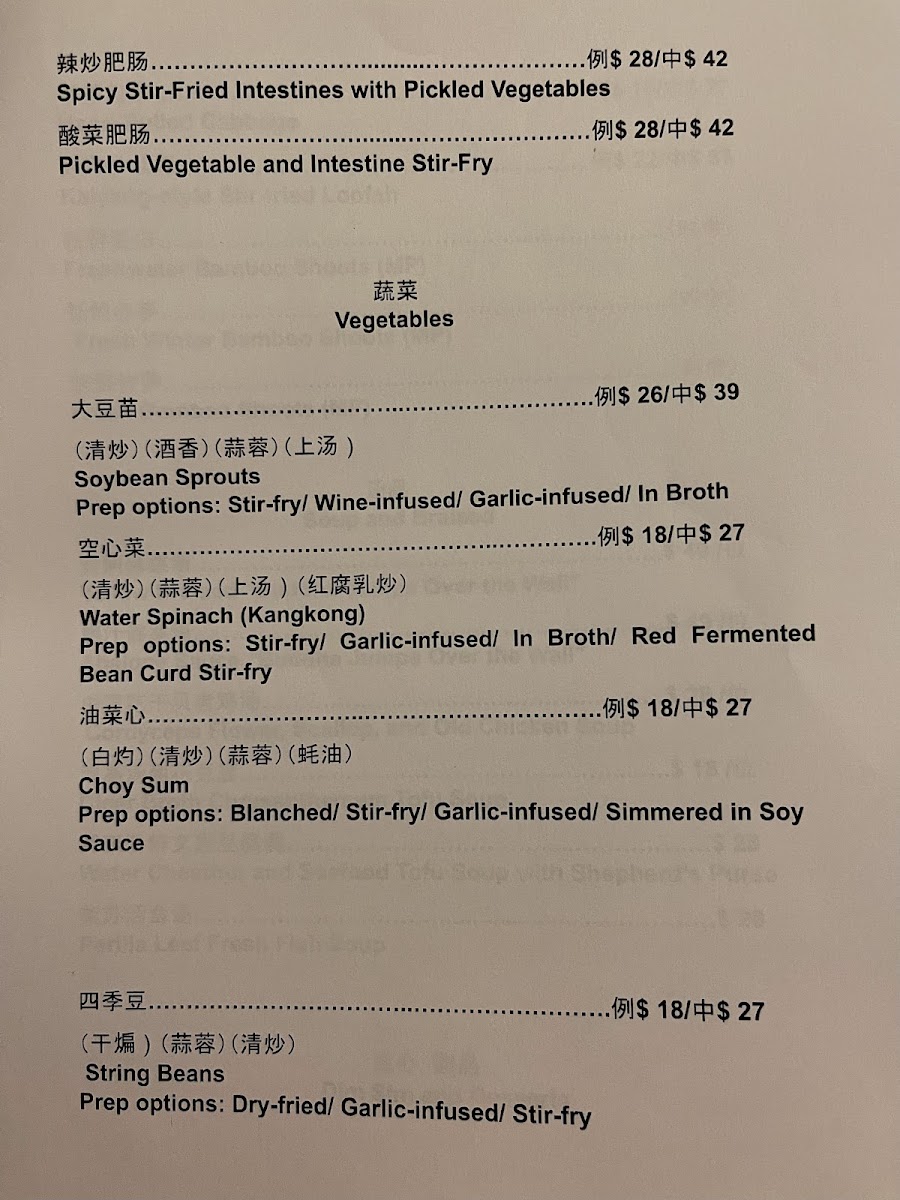 The vegetables section offers options such as Choy Sum, String Beans, Handpulled Cabbage with Dry Shrimp, and Stirfried Japanese Yam with Wood Ear and Pumpkin. Each vegetable dish features multiple preparation styles, including blanching, stir-frying, garlic-infused, and simmered in soy sauce or oyster sauce variants.