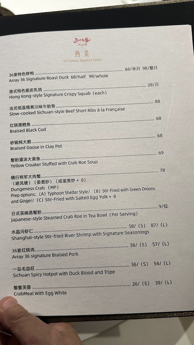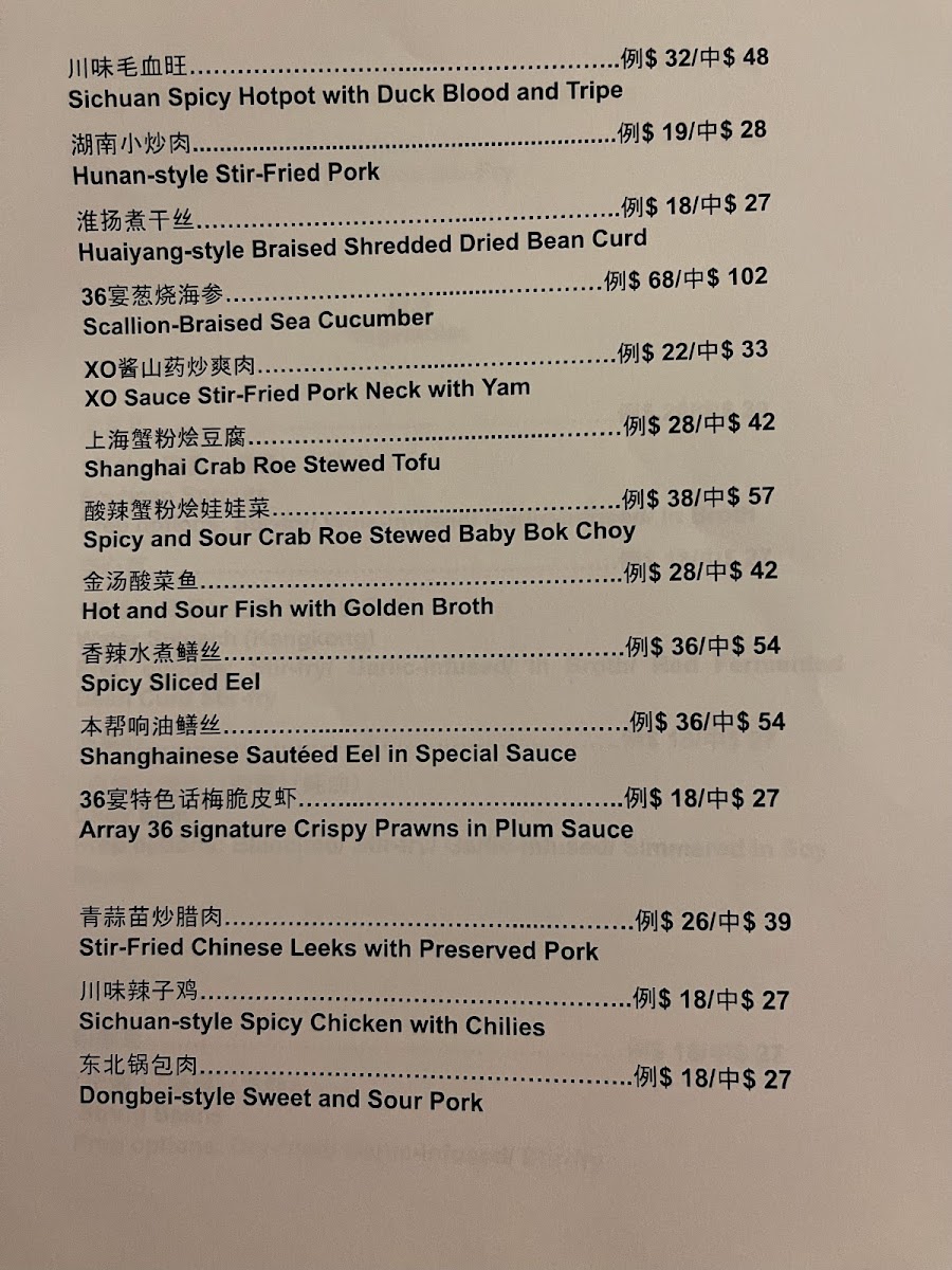 The menu at Array36 - 36宴 presents a selection of fine dining Chinese cuisine, highlighting a variety of traditional and contemporary dishes. It is organized into several categories including vegetables, rice and noodles, and premium seafood offerings such as abalone, sea cucumber, and bird's nest. This structure allows guests to explore both classic preparations and signature items.
